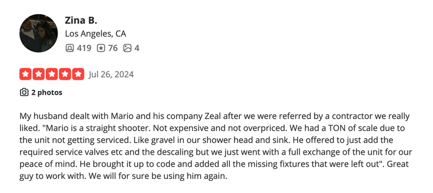We take pride in our work-but don't just take our word for it. Here's what some of our customers have to say about their experience with Zeal Plumbing and Rooter.